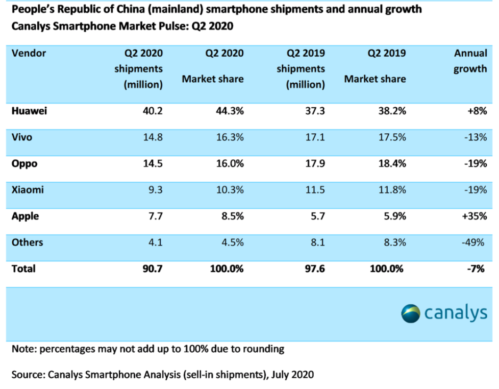 見圳客戶端·深圳新聞網(wǎng)2020年8月3日訊 知名調(diào)研公司Canalys發(fā)布的最新數(shù)據(jù)顯示,盡管與2019年第二季度相比市場(chǎng)萎縮了7%,但中國(guó)智能手機(jī)市場(chǎng)的季度環(huán)比增長(zhǎng)了25%,在2020年第二季度達(dá)到9000多萬臺(tái)。