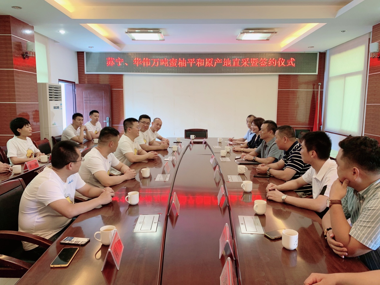 8月26日,蘇寧家樂福中國區(qū)生鮮采購總監(jiān)孫樂超、水果組總監(jiān)孟碩、華南區(qū)采購總監(jiān)周益明,以及蘇寧易購水果組采銷總監(jiān)戴躍等一行來到位于福建省平和縣的華偉農(nóng)業(yè)蜜柚基地,與平和縣委書記郭德志等地方領導共同宣布蘇寧家樂福&華偉農(nóng)業(yè)蜜柚直采基地的正式啟動。