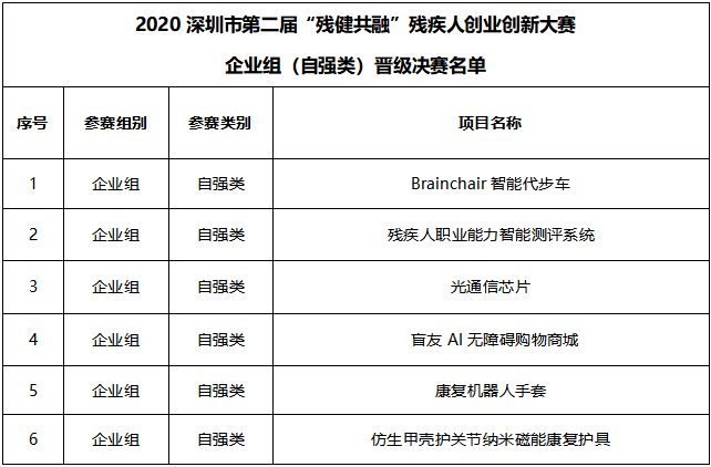 2020深圳市第二屆“殘健共融”殘疾人創(chuàng)業(yè)創(chuàng)新大賽企業(yè)組(自強(qiáng)類(lèi))晉級(jí)決賽名單
