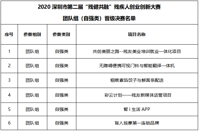 2020深圳市第二屆“殘健共融”殘疾人創(chuàng)業(yè)創(chuàng)新大賽團(tuán)隊(duì)組(自強(qiáng)類(lèi))晉級(jí)決賽名單
