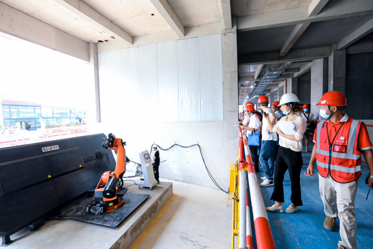 此次觀摩由“三中心一展區(qū)”構(gòu)成,即創(chuàng)魯班獎優(yōu)秀工藝展示中心、科技創(chuàng)新中心、智能指揮中心和建筑內(nèi)展區(qū)。觀摩主要亮點(diǎn)有黨建引領(lǐng)高質(zhì)量發(fā)展、質(zhì)量管理體系與機(jī)制(參建方質(zhì)量管理體系、6σ管理、質(zhì)量管理標(biāo)準(zhǔn)化、精細(xì)化)、創(chuàng)魯班獎優(yōu)秀工藝展示、市工務(wù)署優(yōu)秀工藝工法展示、工程質(zhì)量常見問題治理(樣板引路)、智能建造推動質(zhì)量提升(科技創(chuàng)新展示、抹灰機(jī)器人、實測實量機(jī)器人等智能建造設(shè)備實操演示、BIM技術(shù))、智慧工地展示(“e工務(wù)”APP應(yīng)用與推廣、智慧工地、智能指揮等)、6S管理等,通過現(xiàn)場講解員的介紹,使觀摩人員更加清晰且深入的了解相關(guān)內(nèi)容。