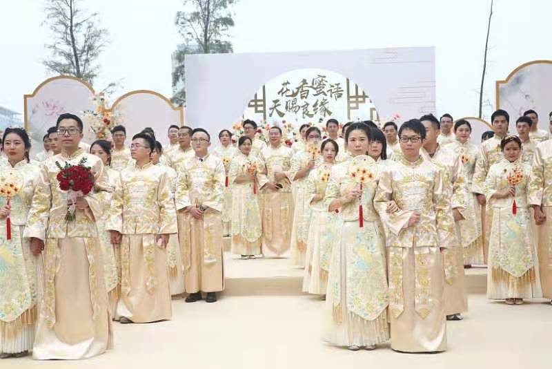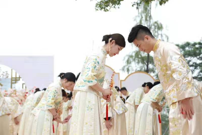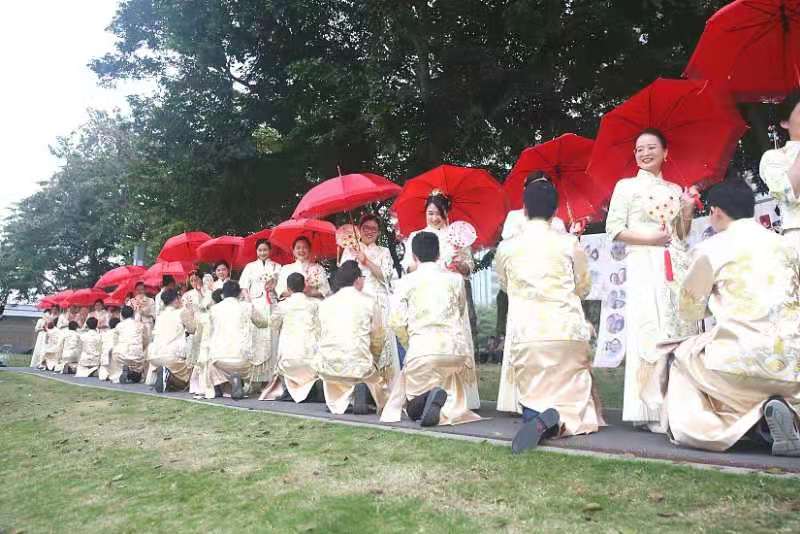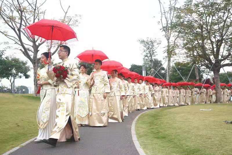 活動伊始,新人手舉紅傘穿過連理橋,在玫瑰園情話闖關(guān),在中西禮堂進行找新娘等默契互動,在自然展覽廳俯瞰香蜜公園全貌,與林立高樓與大片叢林相映成景的最美天際線合影,最后在氤氳浪漫的花香湖和花蜜湖畔,在親友與來賓的祝福下,40對新人身穿中式禮服,誦讀莊嚴的誓詞,許下今生不變的承諾。