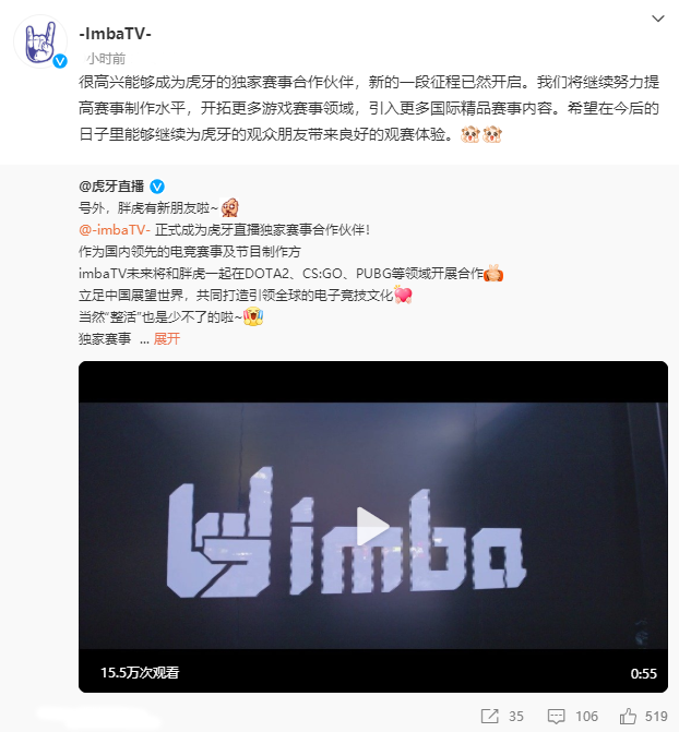本次虎牙公司和imbaTV達(dá)成合作,不僅能加強(qiáng)雙方在DOTA2、CS:GO、PUBG等品類賽事上的優(yōu)勢,也與虎牙對電競賽事多元布局的計(jì)劃高度契合。