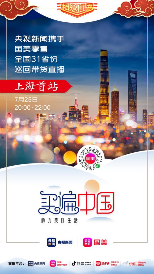 7月25日晚8點(diǎn),“買遍中國(guó)·助力美好生活——央視新聞&國(guó)美零售全國(guó)31省份巡回帶貨直播”首場(chǎng)將在上海復(fù)星藝術(shù)中心正式啟動(dòng),這也是國(guó)美首次將超級(jí)直播搬到戶外來舉辦。