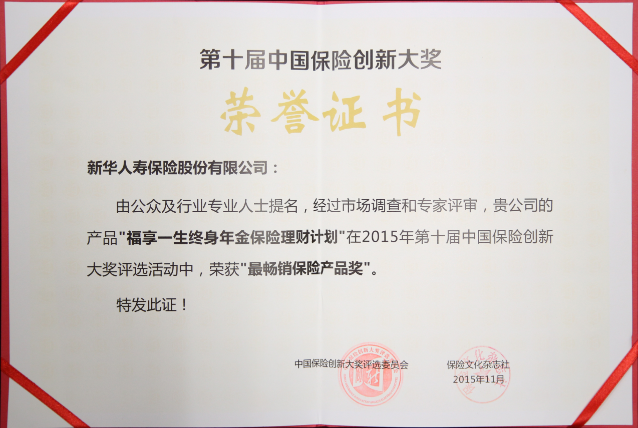 2015年最暢銷保險(xiǎn)產(chǎn)品獎(jiǎng)