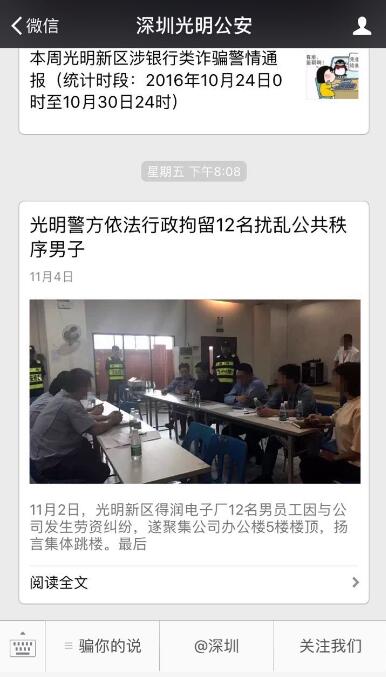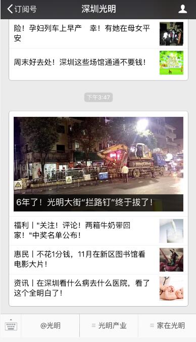 截止到11月7日,光明新區(qū)已有深圳光明、深圳光明公安、深圳光明教育、安全光明、綠色光明、光明文體通、光明改革、深圳市光明新區(qū)人民醫(yī)院等數(shù)10家政府官方微信公眾號(hào)入駐了@深圳。