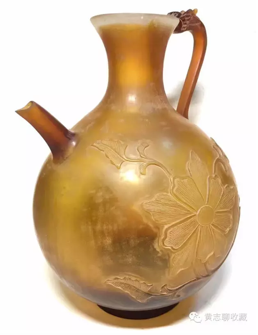 琉璃在唐代極為名貴。這從史書記載可窺一二。房玄齡的《晉書》中有關(guān)于琉璃器的記載“(王濟(jì))性豪侈,麗服玉食……帝嘗幸其宅,供饌甚豐,悉貯琉璃器中?!蓖鯘?jì)在招待皇帝時用了成套的琉璃碗盤,以逞其豪富,可見當(dāng)時琉璃器之貴重或要超過金、銀等器。又如宋代司馬光主編的《資治通鑒》中記載了這樣一段歷史事實:嶺南節(jié)度使路嗣恭在平息叛亂中趁機劫掠商民,得到了大批財物。他把其中一個直徑九寸的琉璃盤獻(xiàn)給了唐代宗。唐代宗非常高興,“以為至寶”。法門寺地宮出土的唐代琉璃器大多為皇家捐贈的禮佛之物也可佐證其珍貴。 這件執(zhí)壺為琉璃材質(zhì),高20cm、腹徑14.5cm,色澤黃褐,半透明,晶瑩潤澤,光澤柔和。小口,束頸,腹部圓鼓,餅足;前有直流,后為龍柄。整體形制穩(wěn)重大方,圓潤飽滿,具有典型的唐代特征。壺身兩面刻有菊紋,線條流暢自然,勁健有力。整體透入出唐人的灑脫自信。這類唐代的琉璃作品存世極少,目前為數(shù)不多的一些作品大多出自窖藏、地宮及貴族墓葬,屬于珍稀文物。此件執(zhí)壺保存完整,尤為難得。 欣賞更多藏品,歡迎瀏覽【黃志博物館】網(wǎng)站:www.huangzhimuseum.com?