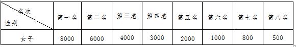 根據(jù)槍聲計時成績錄取女子第一名至第五十名運動員現(xiàn)場頒發(fā)獲獎證書,前八名并分別獲得獎金(單位:人民幣元),前三名另外頒發(fā)獎杯一座、完賽獎牌一枚、領(lǐng)獎服裝一套。