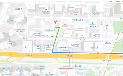 紅框處為除后海大道天橋以外,目前步行前往深圳灣創(chuàng)業(yè)廣場的唯一過街天橋。