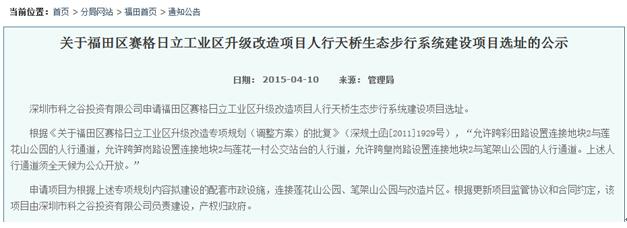 而據(jù)資料記載,市規(guī)土委曾經(jīng)在2015年4月10日,在福田管理局官網(wǎng)上發(fā)布了《關(guān)于福田區(qū)賽格日立工業(yè)區(qū)升級(jí)改造項(xiàng)目人行天橋生態(tài)步行系統(tǒng)建設(shè)項(xiàng)目選址的公示》,其中明確提到“根據(jù)《關(guān)于福田區(qū)賽格日立工業(yè)區(qū)升級(jí)改造專項(xiàng)規(guī)劃(調(diào)整方案)的批復(fù)》(深規(guī)土函[2011]1929號(hào)),‘允許跨彩田路設(shè)置連接地塊2與蓮花山公園的人行通道,允許跨筍崗路設(shè)置連接地塊2與蓮花一村公交站臺(tái)的人行道,允許跨皇崗路設(shè)置連接地塊2與筆架山公園的人行通道。上述人行通道須全天候?yàn)楣婇_放’?!?/p>
