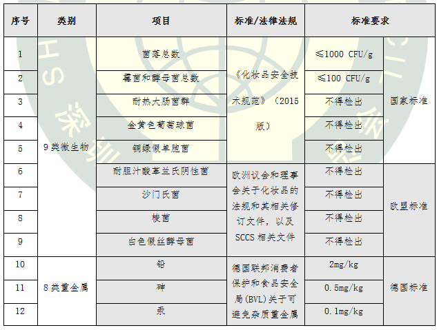 本次比較試驗檢測項目廣泛征求了企業(yè)、業(yè)內(nèi)專家和第三方檢測機構(gòu)的意見,不僅依據(jù)了現(xiàn)行國家標(biāo)準(zhǔn),而且在國標(biāo)基礎(chǔ)上結(jié)合嚴(yán)格的歐盟標(biāo)準(zhǔn) 《歐盟化妝品法規(guī)EC1223/2009及其相關(guān)修訂文件》、《歐盟消費者安全科學(xué)委員會(SCCS)關(guān)于化妝品安全的第九版指南》、德國聯(lián)邦消費者保護和食品安全局(BVL)關(guān)于可避免雜質(zhì)重金屬限值的調(diào)查報告、美國《聯(lián)邦食品、藥品和化妝品法案》、日本厚生勞動省《藥事法》以及其它相關(guān)標(biāo)準(zhǔn)、法規(guī)和技術(shù)文件的要求,采用國家標(biāo)準(zhǔn)檢測方法、實驗室通用方法等手段進行檢測,從44項指標(biāo)展開氣墊粉底安全性品質(zhì)大比拼,詳細(xì)項目與要求見表1。