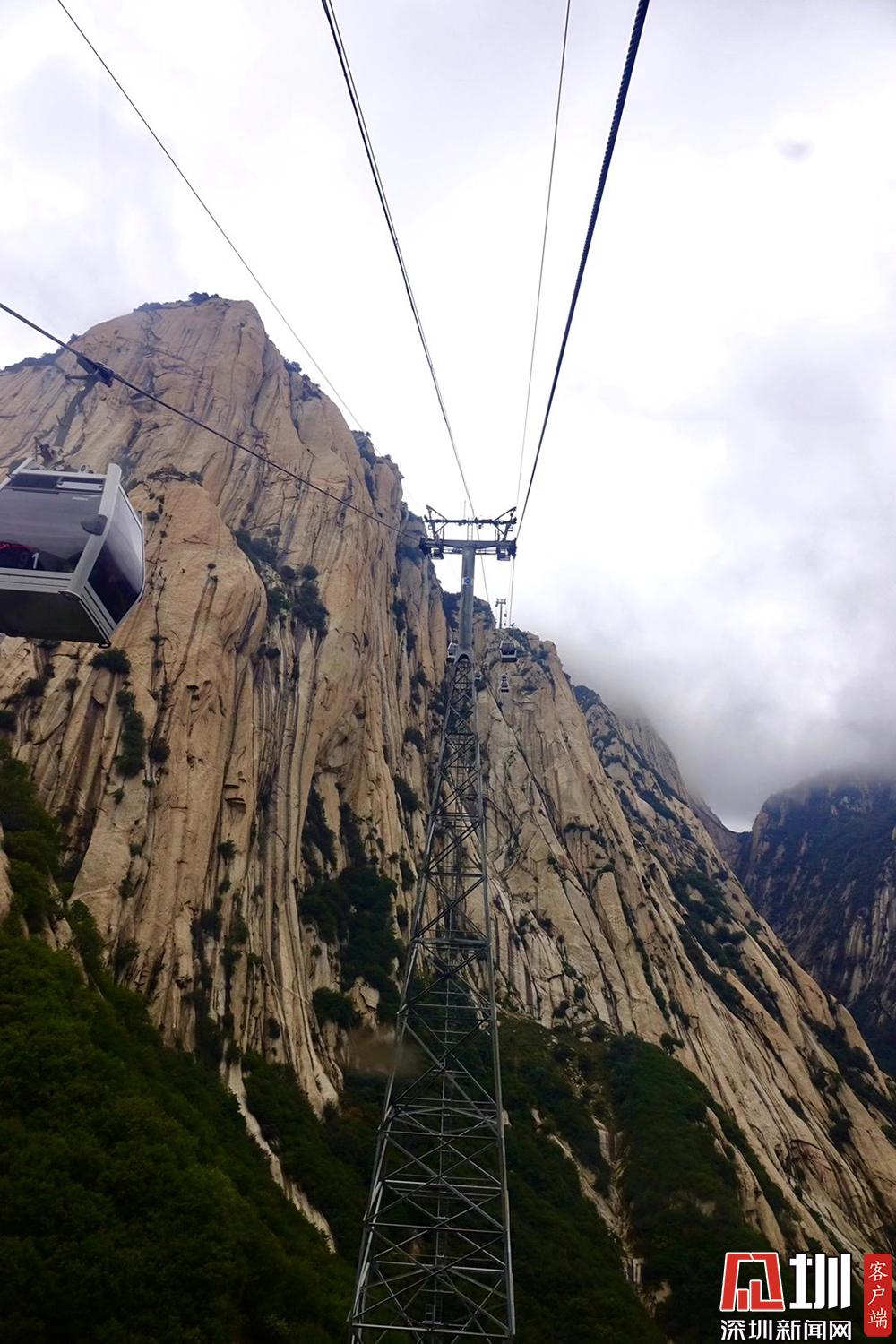 華山西峰的太華索道是迄今為止世界上第一條采取崖壁開鑿硐室站房、兩上兩下的起伏式走向、設(shè)中間站的單線循環(huán)脫掛式索道,總計(jì)投資5億余元建設(shè)。李酮攝。