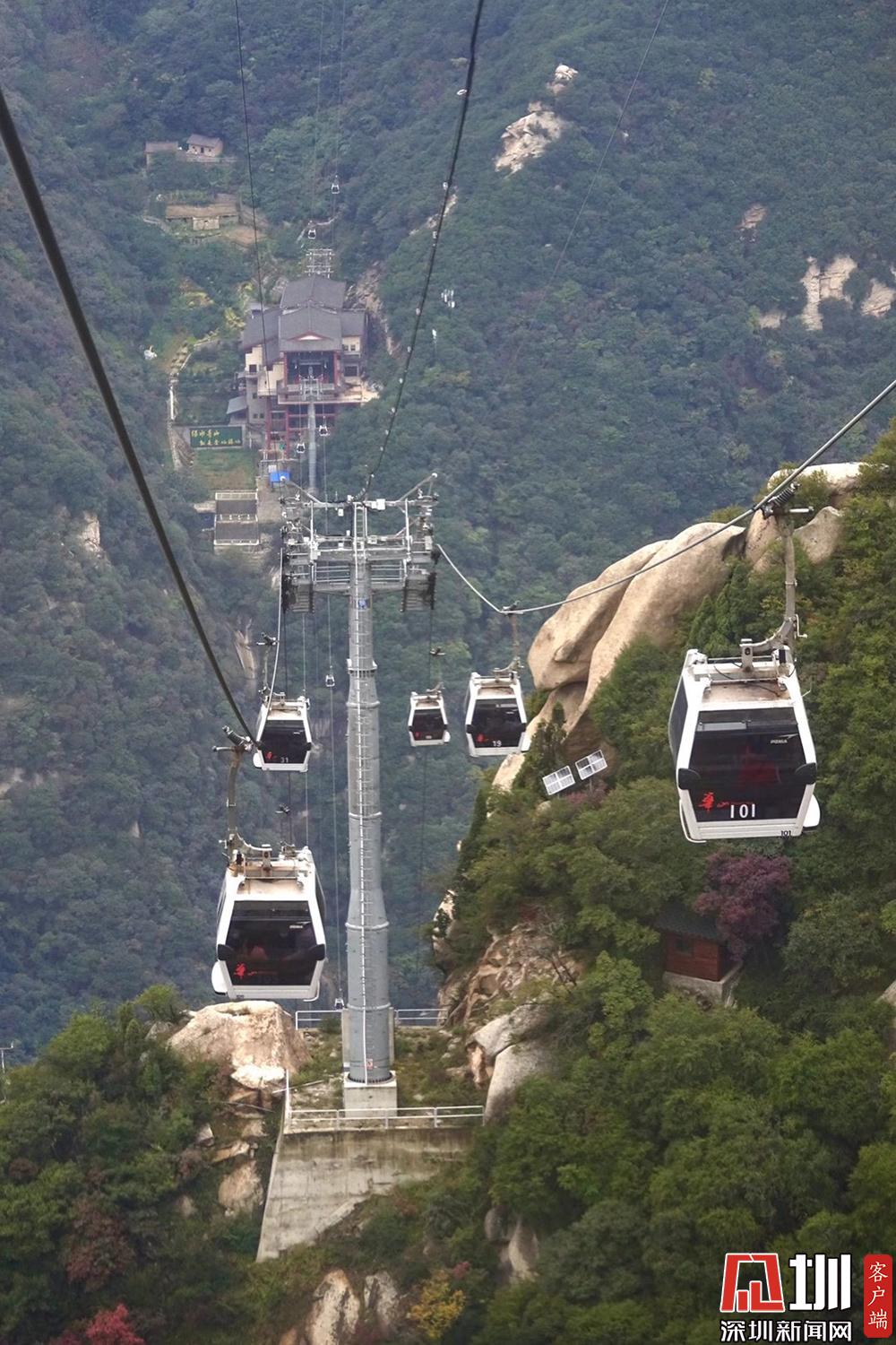 索道設(shè)備由法國波馬公司制造,整體安全與運營系統(tǒng)采用最尖端的客運索道技術(shù)。華山索道一覽。李仁奇攝。