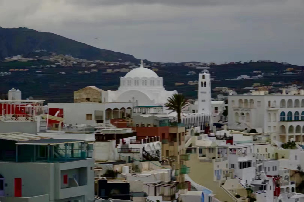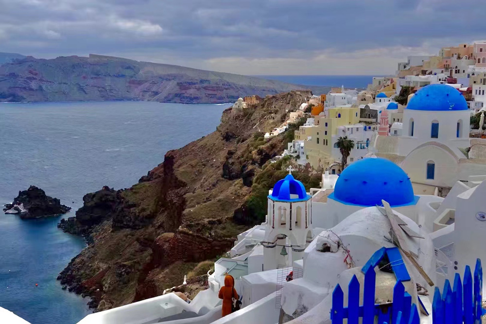 費(fèi)拉碼頭附近有許多懸崖,無數(shù)的白色小屋依山而建,與天空、海洋混成一體,這是地中海獨(dú)有的景觀。李仁奇 攝