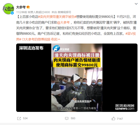 6.【法治事件全國(guó)多個(gè)經(jīng)營(yíng)肉夾饃的店家“潼關(guān)肉夾饃”這幾個(gè)字不能用了,不但要賠償給潼關(guān)肉夾饃協(xié)會(huì)3萬(wàn)到5萬(wàn)元不等的賠償金,要繼續(xù)用這個(gè)商標(biāo),還得向協(xié)會(huì)交99800元。11月26日,國(guó)家知識(shí)產(chǎn)權(quán)局針對(duì)“逍遙鎮(zhèn)胡辣湯”和“潼關(guān)肉夾饃”的商標(biāo)糾紛事件做了回應(yīng)。當(dāng)天,潼關(guān)肉夾饃協(xié)會(huì)就“潼關(guān)肉夾饃”商標(biāo)進(jìn)行維權(quán)一事向全國(guó)潼關(guān)肉夾饃經(jīng)營(yíng)者道歉。