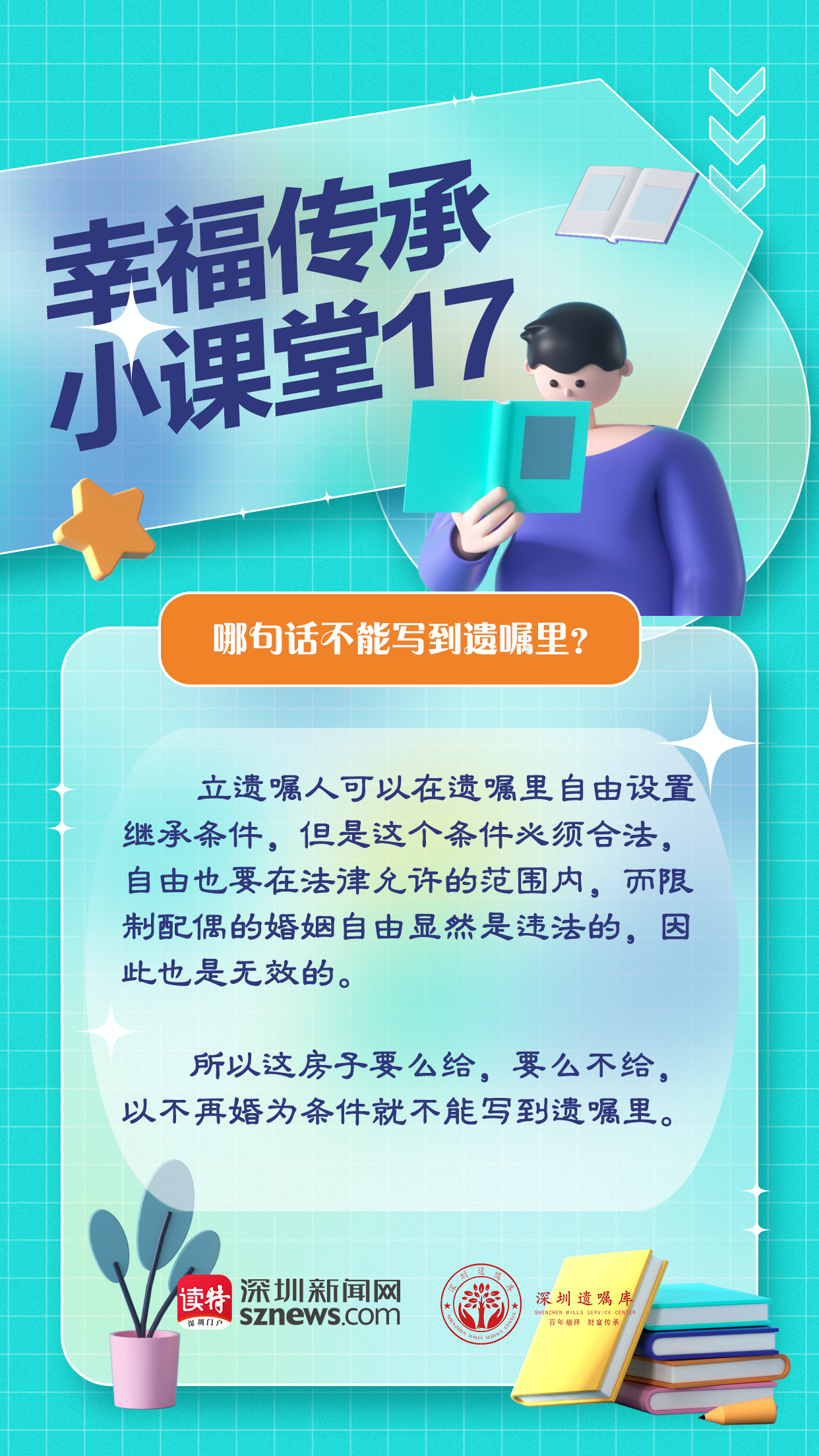 由深圳新聞網聯合廣東嘉得信律師事務所、深圳遺囑庫特別策劃的“幸福傳承小課堂”第17期就來說說,哪些話不能寫到遺囑里。上述案例的老兩口考慮很周全,他們把各個銀行的存款都列了一個明細單,標明了分配方式,哪一筆給兒子,哪一筆留給女兒,總體來說兒女分到的財產都差不多。