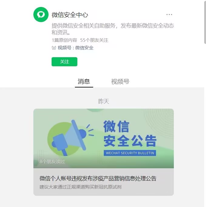 公告強調(diào),“利用微信個人帳號發(fā)布抗原檢測試劑、藥品等營銷信息的行為,違反了相關(guān)法律法規(guī),也違反了《微信個人帳號使用規(guī)范》,微信安全團(tuán)隊將對違法違規(guī)行為進(jìn)行堅決處理、嚴(yán)厲打擊?!?br/>