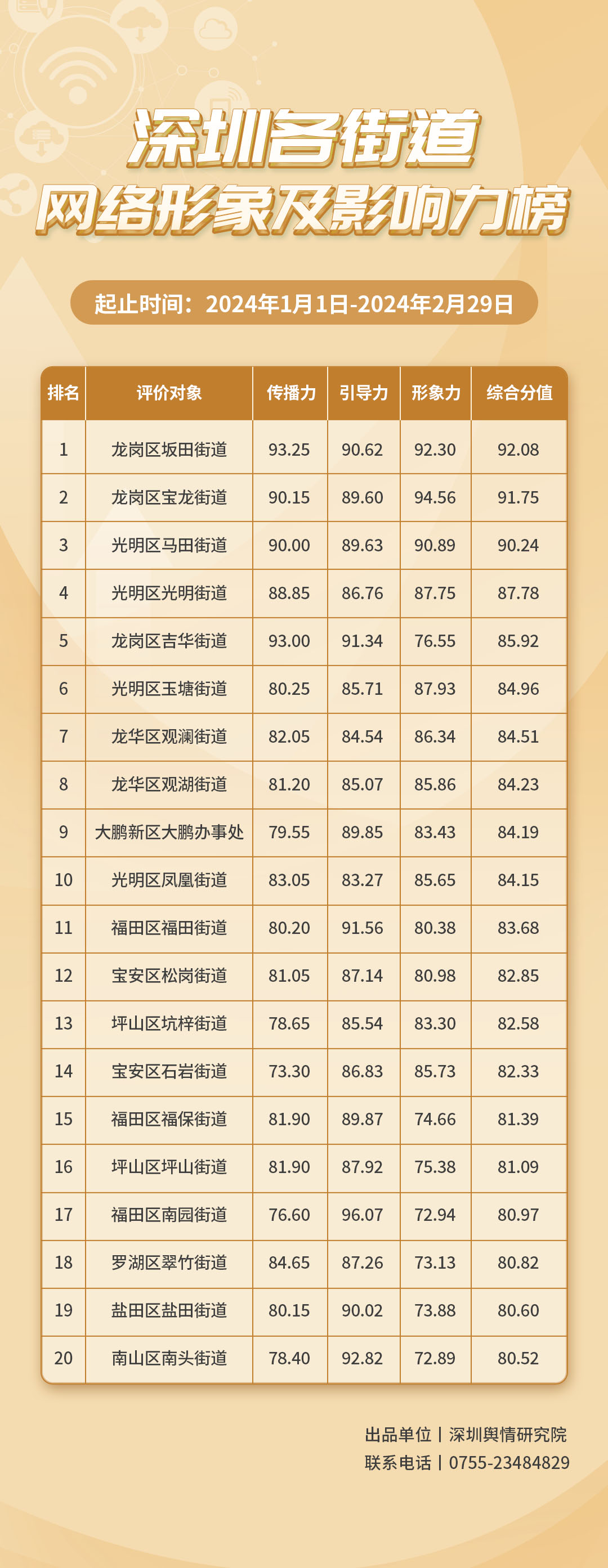 深圳新聞網3月21日訊(記者 王亞男 實習生 上官新昕) 2024年3月20日,深圳輿情研究院編制推出《深圳各街道網絡形象及影響力榜》(1-2月期),公布深圳市20個網絡形象及影響力建設成效靠前的街道,并指出深入了解各街道的網絡形象構建狀況和社會影響,有助于推動街道治理“提質增效”,增加城市高質量發(fā)展動能。