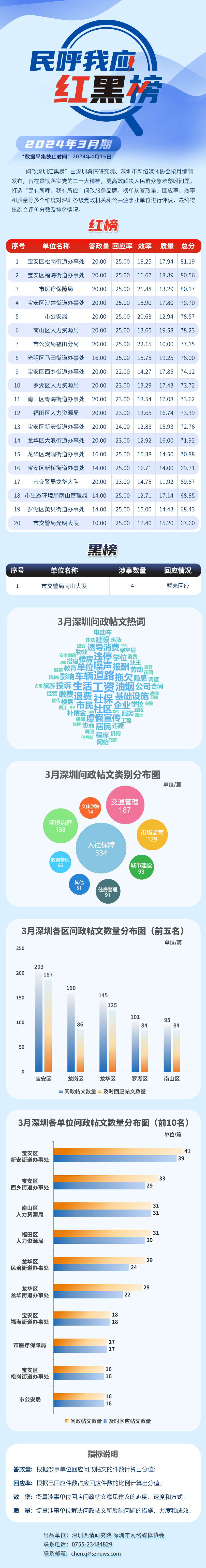2024年3月,共有20家單位因積極開展網(wǎng)絡(luò)答政工作,贏得群眾的支持與認(rèn)可,最終登上“紅榜”,它們分別是:寶安區(qū)松崗街道辦事處、寶安區(qū)福海街道辦事處、市醫(yī)療保障局、寶安區(qū)沙井街道辦事處、市公安局、南山區(qū)人力資源局、市公安局福田分局、光明區(qū)馬田街道辦事處、寶安區(qū)西鄉(xiāng)街道辦事處、羅湖區(qū)人力資源局、南山區(qū)粵海街道辦事處、福田區(qū)人力資源局、寶安區(qū)新安街道辦事處、龍華區(qū)大浪街道辦事處、龍華區(qū)觀瀾街道辦事處、寶安區(qū)新橋街道辦事處、市交警局龍華大隊(duì)、市生態(tài)環(huán)境局南山管理局、羅湖區(qū)黃貝街道辦事處、市交警局光明大隊(duì)。另外,市交警局南山大隊(duì)因相關(guān)帖文回應(yīng)率偏低,整體答政效果不佳,被列入了“黑榜”。