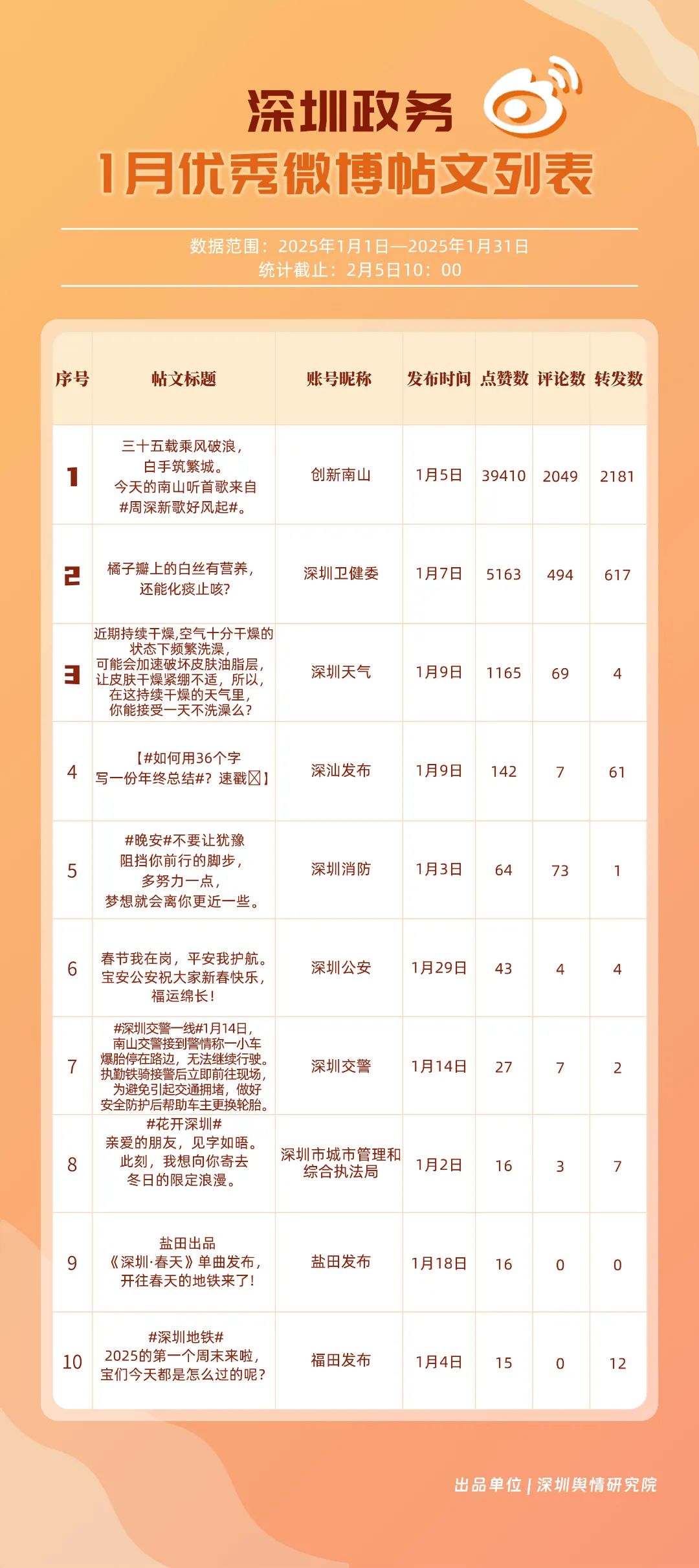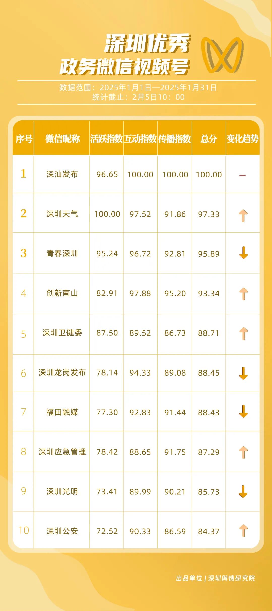 2025年1月期《深圳優(yōu)秀政務新媒體矩陣》發(fā)布,一同揭曉哪些政務新媒體矩陣能夠憑借其卓越表現(xiàn)脫穎而出,成為推動政務信息傳播與服務模式創(chuàng)新的領航者,引領政務新媒體運營邁向新高度。