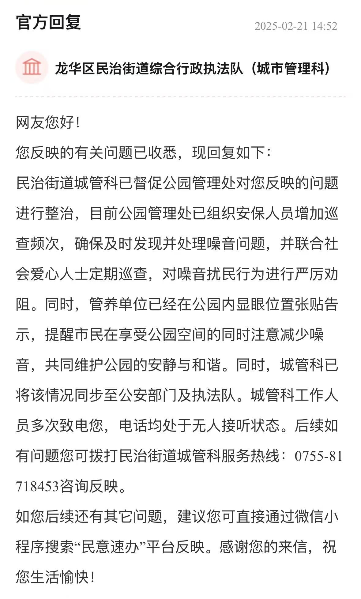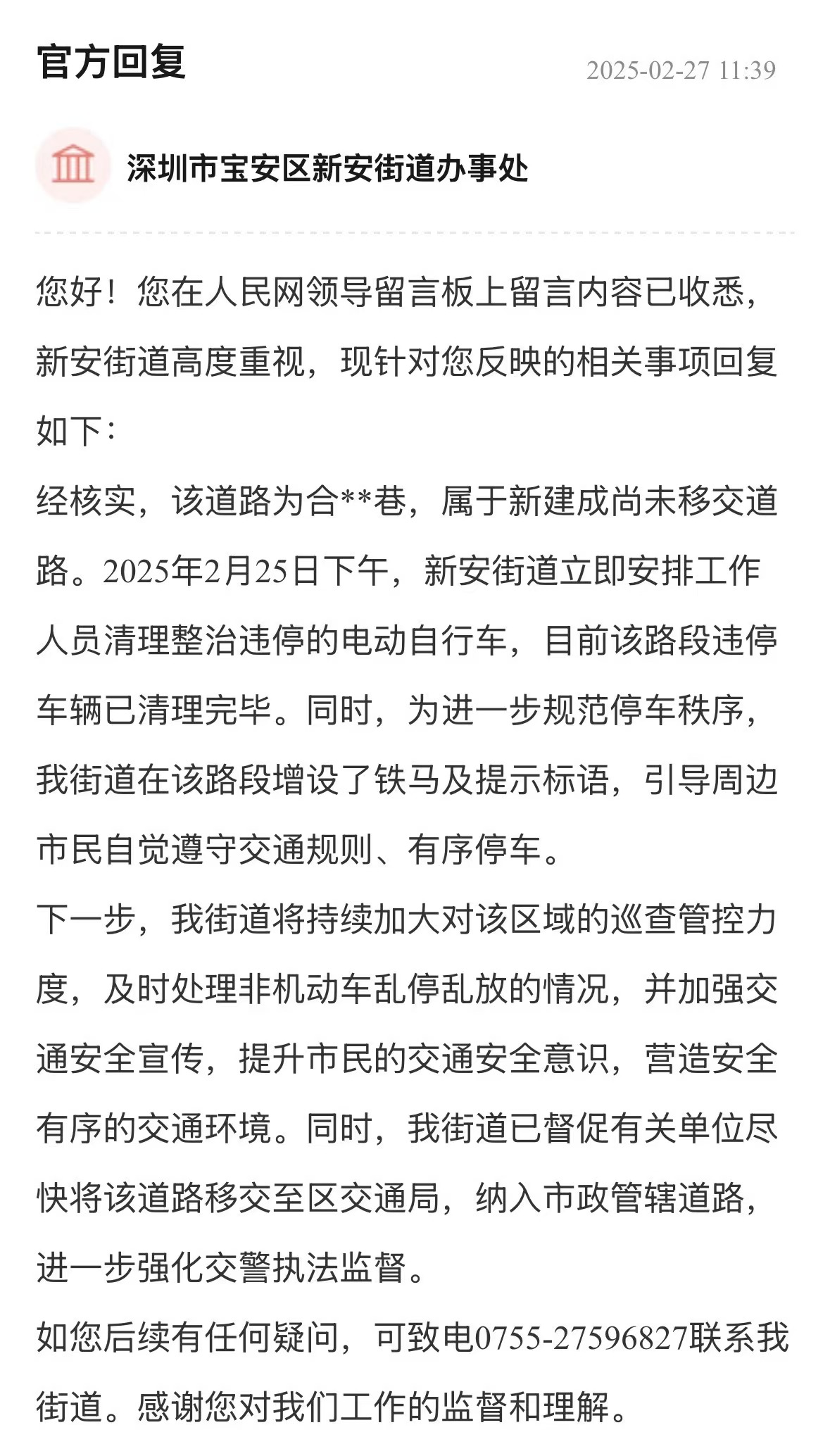 案例點(diǎn)評(píng):街道辦針對(duì)車(chē)輛管理、消防問(wèn)題多管齊下,旨在營(yíng)造一個(gè)通暢、安全的出行和生活環(huán)境,態(tài)度值得肯定。回應(yīng)展示了街道辦構(gòu)建的“專(zhuān)項(xiàng)巡查+設(shè)施建設(shè)+行為引導(dǎo)”綜合治理體系,精準(zhǔn)直擊問(wèn)題核心,兼顧當(dāng)下整治與長(zhǎng)遠(yuǎn)規(guī)劃,切實(shí)保障居民居住和生活安全,其系統(tǒng)性解決思路對(duì)同類(lèi)區(qū)域治理具有重要參考價(jià)值。
