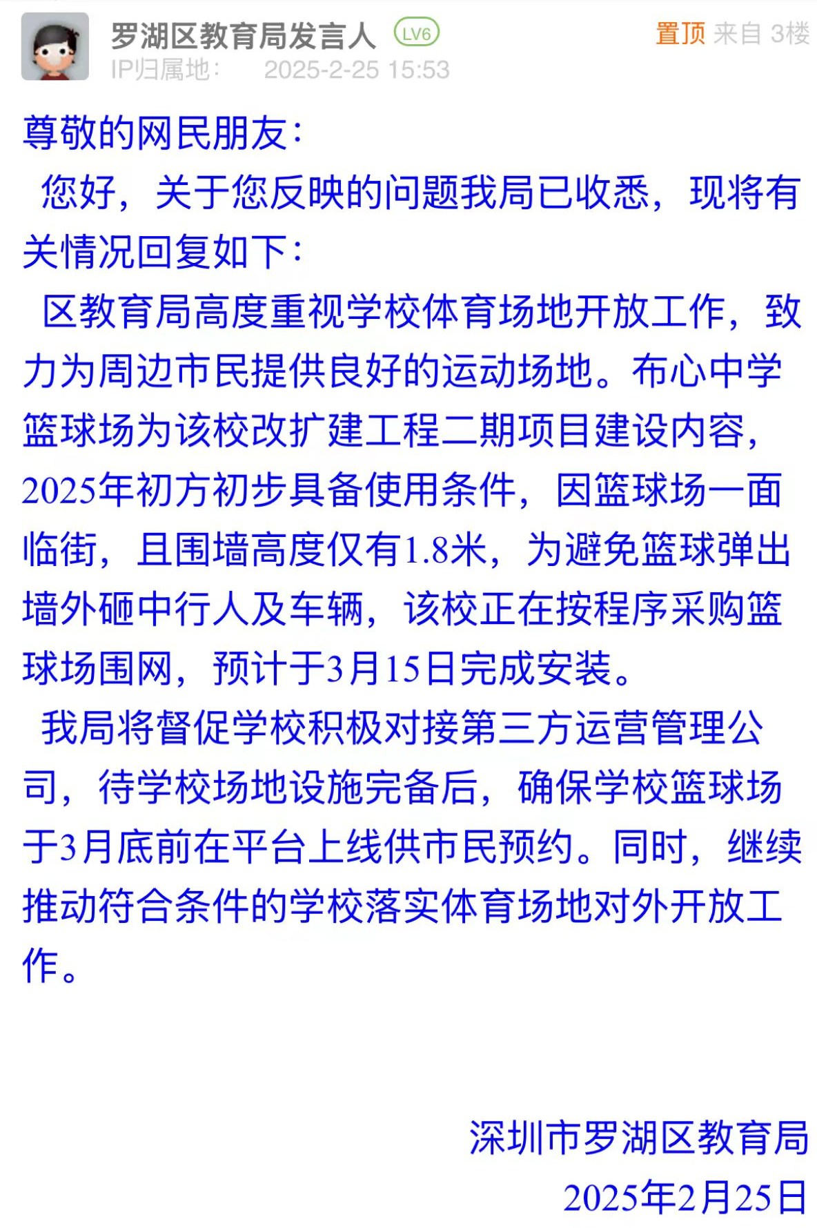 案例點(diǎn)評(píng):市民關(guān)注布心中學(xué)籃球場(chǎng)開(kāi)放時(shí)間,反映出對(duì)公共運(yùn)動(dòng)空間的迫切需求。羅湖區(qū)教育局詳細(xì)說(shuō)明場(chǎng)地未開(kāi)放原因及施工節(jié)點(diǎn),并明確后續(xù)開(kāi)放計(jì)劃,有效化解群眾疑慮,有助于“全民健身”政策更好落地。