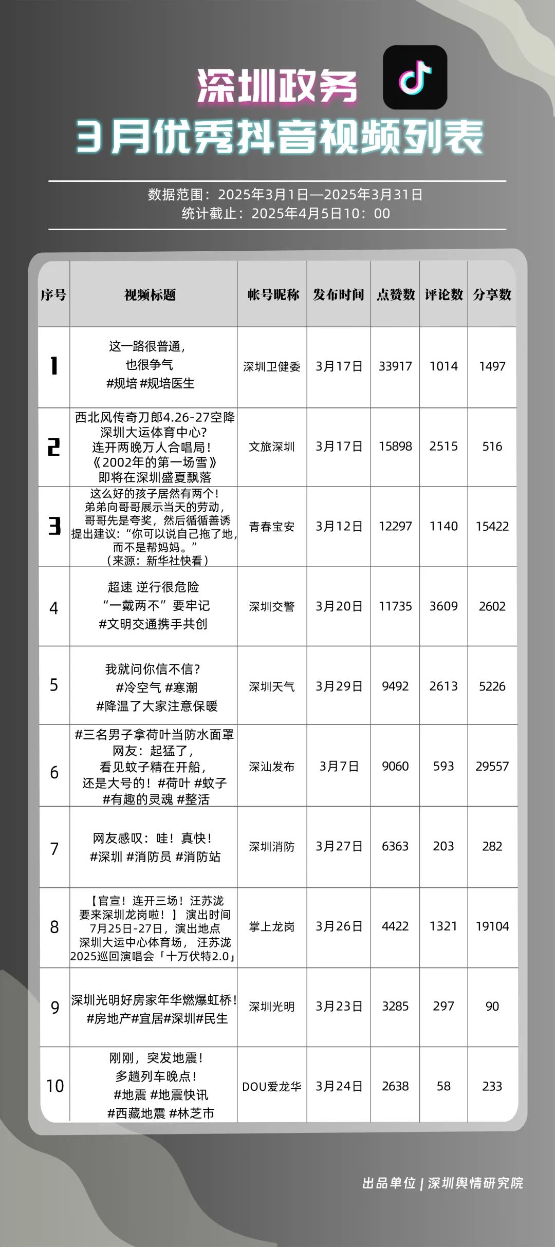 3月,“深汕發(fā)布”“掌上龍崗”“深圳天氣”“文旅深圳”“深圳衛(wèi)健委”“青春寶安”“深圳交警”“DOU愛龍華”“青春深圳”“深圳工會(huì)”共10個(gè)政務(wù)抖音號(hào)獲得“深圳優(yōu)秀政務(wù)抖音號(hào)”稱號(hào)。其中,“深汕發(fā)布”位于榜單第一名,3月共收獲5萬(wàn)余次點(diǎn)贊、8萬(wàn)余次轉(zhuǎn)發(fā),反映出賬號(hào)作品的較高吸引力;“深圳龍崗”以98.85分位于榜單第二名,與榜首分差微小,整體實(shí)力不俗。緊隨其后的分別是“深圳天氣”“文旅深圳”“深圳衛(wèi)健委”,三賬號(hào)產(chǎn)出內(nèi)容優(yōu)質(zhì),也獲得較高評(píng)分。相關(guān)上榜單位展現(xiàn)了深圳政務(wù)新媒體賬號(hào)在短視頻傳播領(lǐng)域的創(chuàng)新探索力與傳播實(shí)效性。