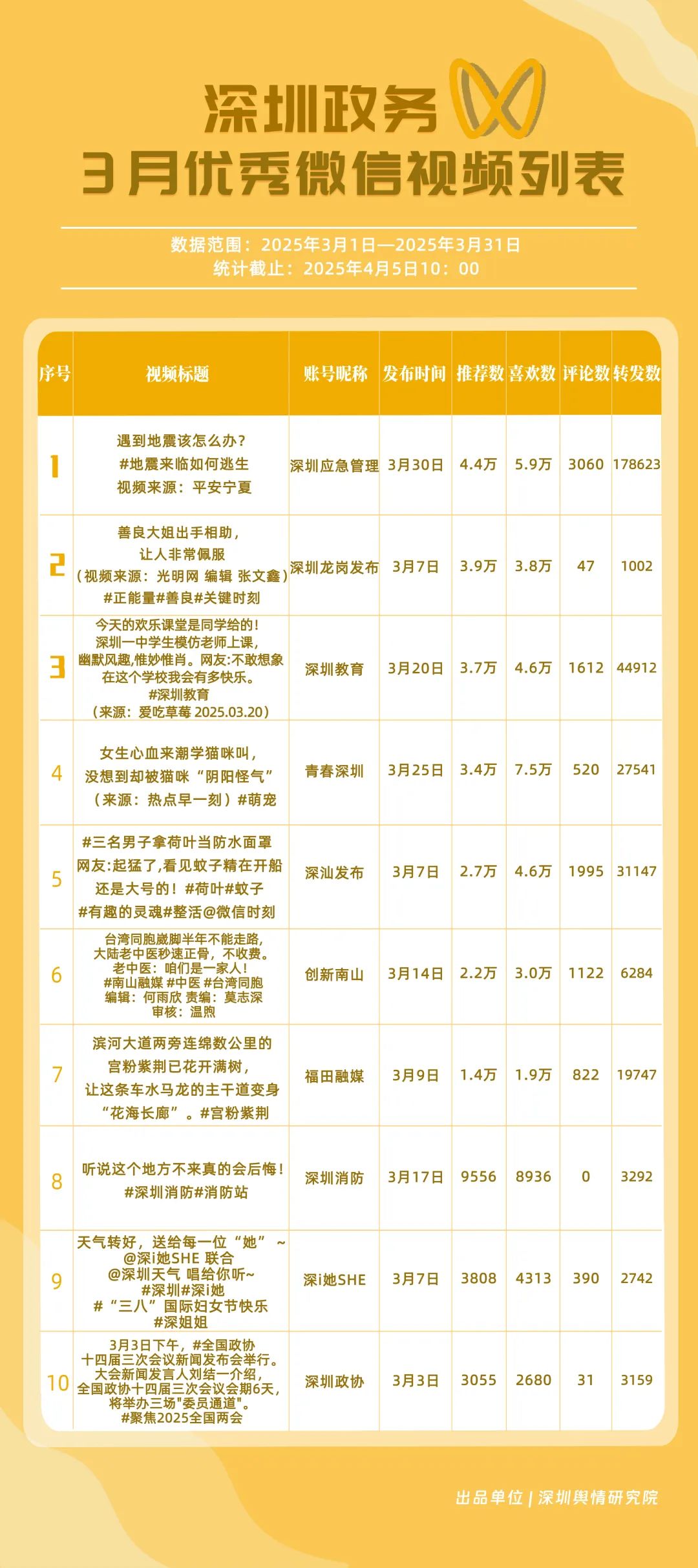 3月,獲“深圳優(yōu)秀政務(wù)微信視頻號(hào)”稱號(hào)的分別是“深圳應(yīng)急管理”“深圳教育”“深汕發(fā)布”“青春深圳”“創(chuàng)新南山”“福田融媒”“深圳龍崗發(fā)布”“深圳光明”“文旅深圳”“深圳天氣”。其中,“深圳應(yīng)急管理”以20余篇作品收獲超20萬(wàn)次轉(zhuǎn)發(fā),躍居第一名,一期有關(guān)“地震來(lái)臨如何逃生”的視頻收獲超17萬(wàn)次轉(zhuǎn)發(fā),展現(xiàn)了其內(nèi)容的高實(shí)用性。“深圳教育”“深汕發(fā)布”位于榜單第二、三位,總分超90分,反映出兩賬號(hào)在民生教育、區(qū)域宣傳領(lǐng)域擁有較好傳播效果。“青春深圳”“創(chuàng)新南山”“福田融媒”等賬號(hào)也在3月發(fā)布優(yōu)質(zhì)視頻內(nèi)容,展現(xiàn)了深圳政務(wù)新媒體在視頻號(hào)平臺(tái)宣傳的創(chuàng)新探索。