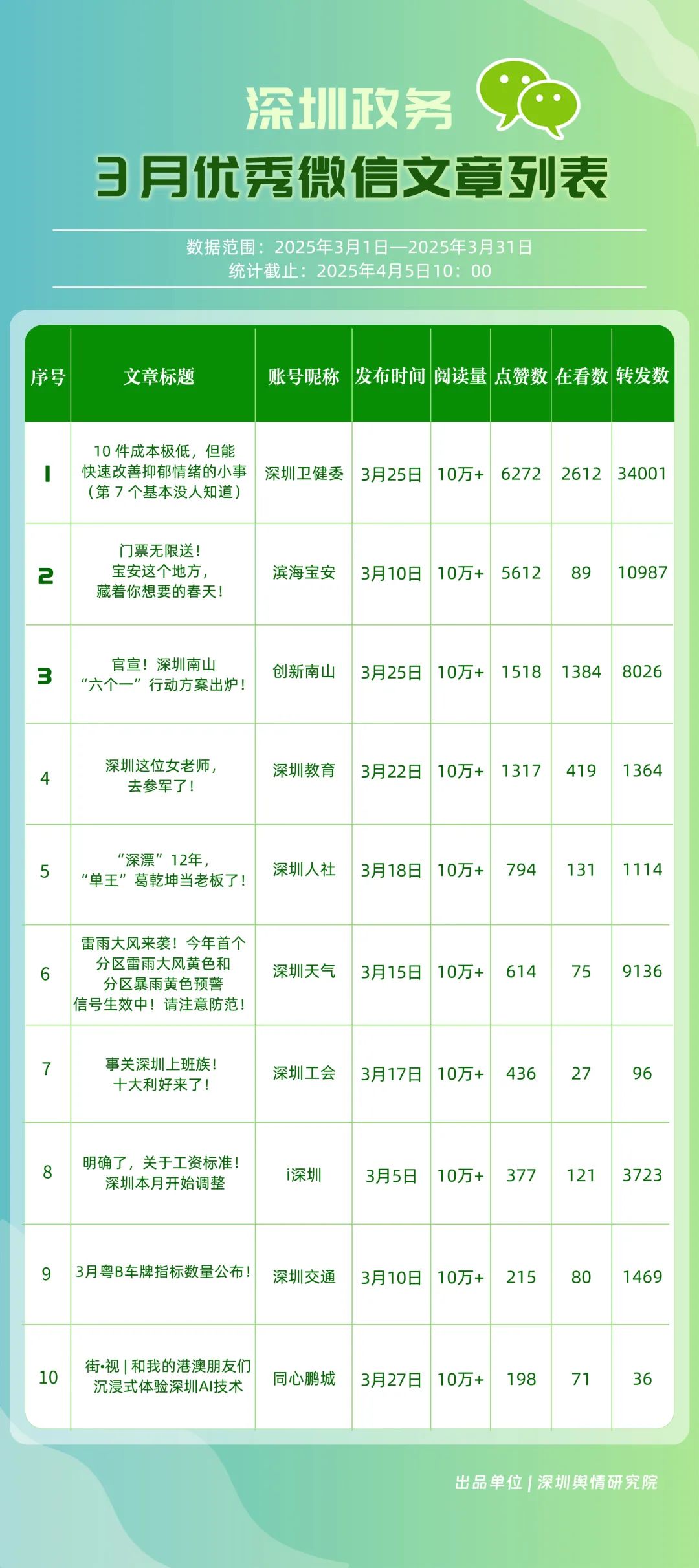 3月,市衛(wèi)生健康委、龍崗區(qū)、市氣象局、深汕特別合作區(qū)、南山區(qū)、福田區(qū)、市應(yīng)急管理局、龍華區(qū)、寶安區(qū)、光明區(qū)榮登“深圳優(yōu)秀政務(wù)新媒體矩陣”榜單。3月,市衛(wèi)生健康委新媒體矩陣持續(xù)關(guān)注市民身心健康,發(fā)布健康科普內(nèi)容,穩(wěn)居榜單第一位;龍崗區(qū)新媒體矩陣在抖音、微信視頻號(hào)平臺(tái)發(fā)力宣傳,躍居榜單第二位;市氣象局新媒體矩陣在微博平臺(tái)連續(xù)多期獲得滿分,持續(xù)以氣象預(yù)警與生活指南結(jié)合的內(nèi)容模式,為市民帶來(lái)便利信息。以上賬號(hào)在“深圳優(yōu)秀政務(wù)新媒體矩陣”榜單中榮獲前三名。此外,深汕特別合作區(qū)新媒體矩陣積極發(fā)布網(wǎng)絡(luò)熱點(diǎn)內(nèi)容,收獲較多網(wǎng)民關(guān)注分享;南山區(qū)新媒體矩陣多平臺(tái)實(shí)力強(qiáng)勁,以88.37分居于榜單第五位。值得關(guān)注的是,寶安區(qū)新媒體矩陣時(shí)隔多期躋身榜單前十名,多平臺(tái)均衡發(fā)展成效初顯。