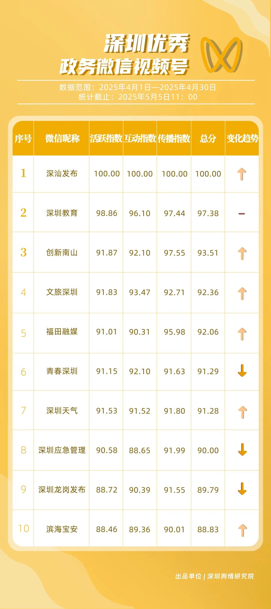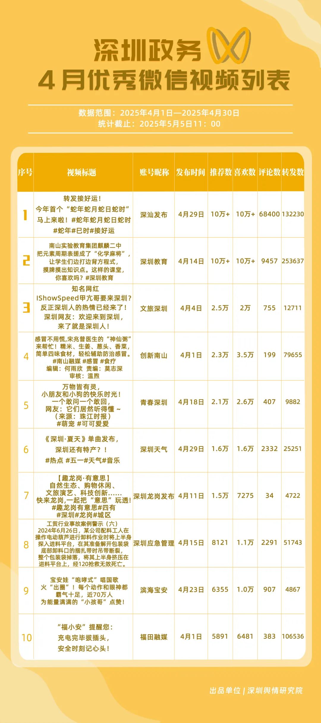 4月,獲“深圳優(yōu)秀政務微信視頻號”稱號的是“深汕發(fā)布”“深圳教育”“創(chuàng)新南山”“文旅深圳”“福田融媒”“青春深圳”“深圳天氣”“深圳應急管理”“深圳龍崗發(fā)布”“濱海寶安”。其中,“深汕發(fā)布”憑借亮眼的數(shù)據(jù)表現(xiàn)成為榜首,其一條有關“蛇年蛇月蛇日蛇時”的視頻作品點贊量超10萬次、評論量超6.8萬次,轉發(fā)量超13萬次;“深圳教育”持續(xù)穩(wěn)定輸出優(yōu)質內容,以扎實的運營實力鞏固自身影響力,位居榜單第2位;“創(chuàng)新南山”“文旅深圳”“福田融媒”分別位列榜單第3、4、5位,總分超92分,在區(qū)域形象宣傳、文旅資源推廣等方面展現(xiàn)出卓越的傳播效能,成為傳遞區(qū)域特色與發(fā)展動態(tài)的重要窗口。