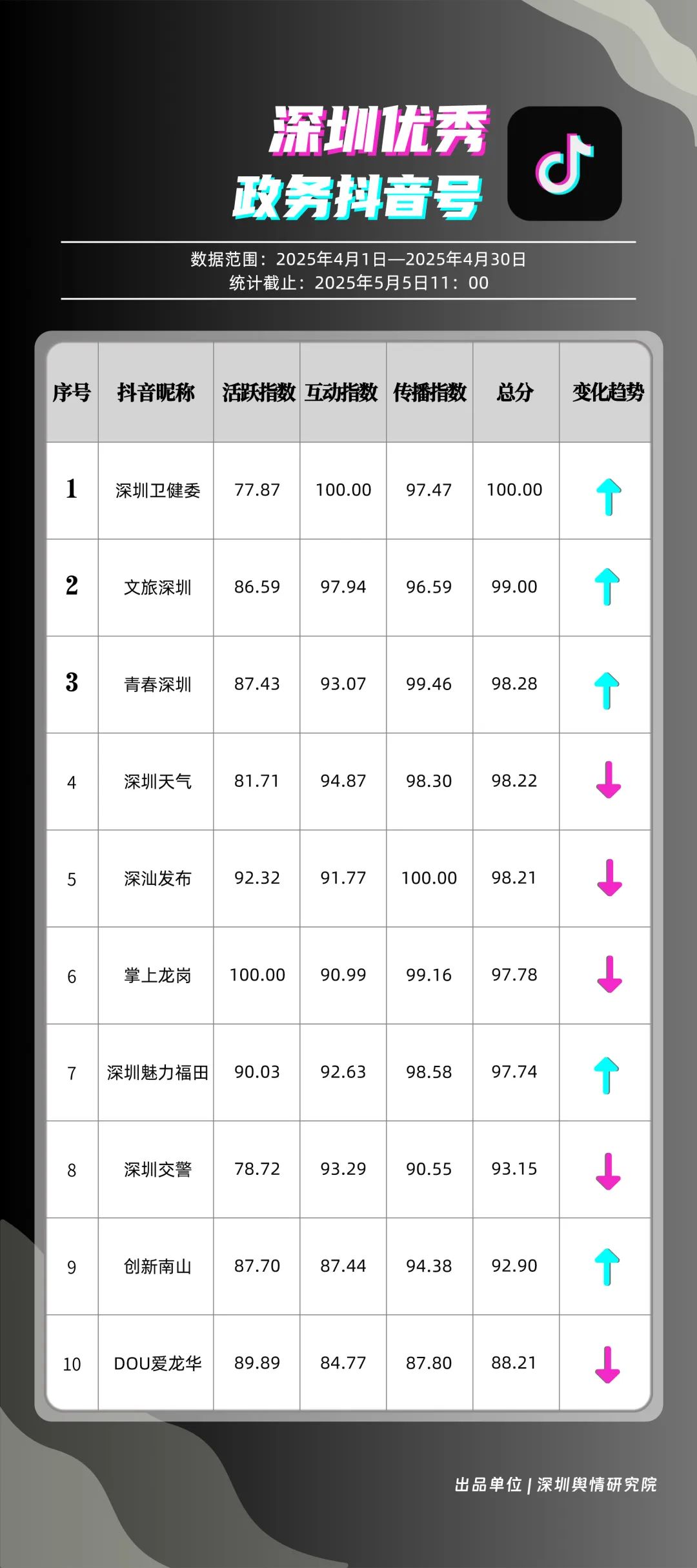 4月,“深圳衛(wèi)健委”“文旅深圳”“青春深圳”“深圳天氣”“深汕發(fā)布”“掌上龍崗”“深圳魅力福田”“深圳交警”“創(chuàng)新南山”“DOU愛龍華”共10個政務抖音號獲得“優(yōu)秀政務抖音號”稱號。4月,“深圳衛(wèi)健委”“文旅深圳”“青春深圳”憑借新穎的內容策劃、生動的短視頻呈現(xiàn)方式,實現(xiàn)排名提升,位居榜單前三?!吧钲谔鞖狻薄吧钌前l(fā)布”緊隨其后,以優(yōu)質實用的內容、接地氣的表達,持續(xù)擴大政務新媒體的傳播聲量。上榜賬號積極探索創(chuàng)新傳播路徑,以生動有趣的方式傳遞政務信息,為深圳政務新媒體在短視頻領域的發(fā)展注入新活力。