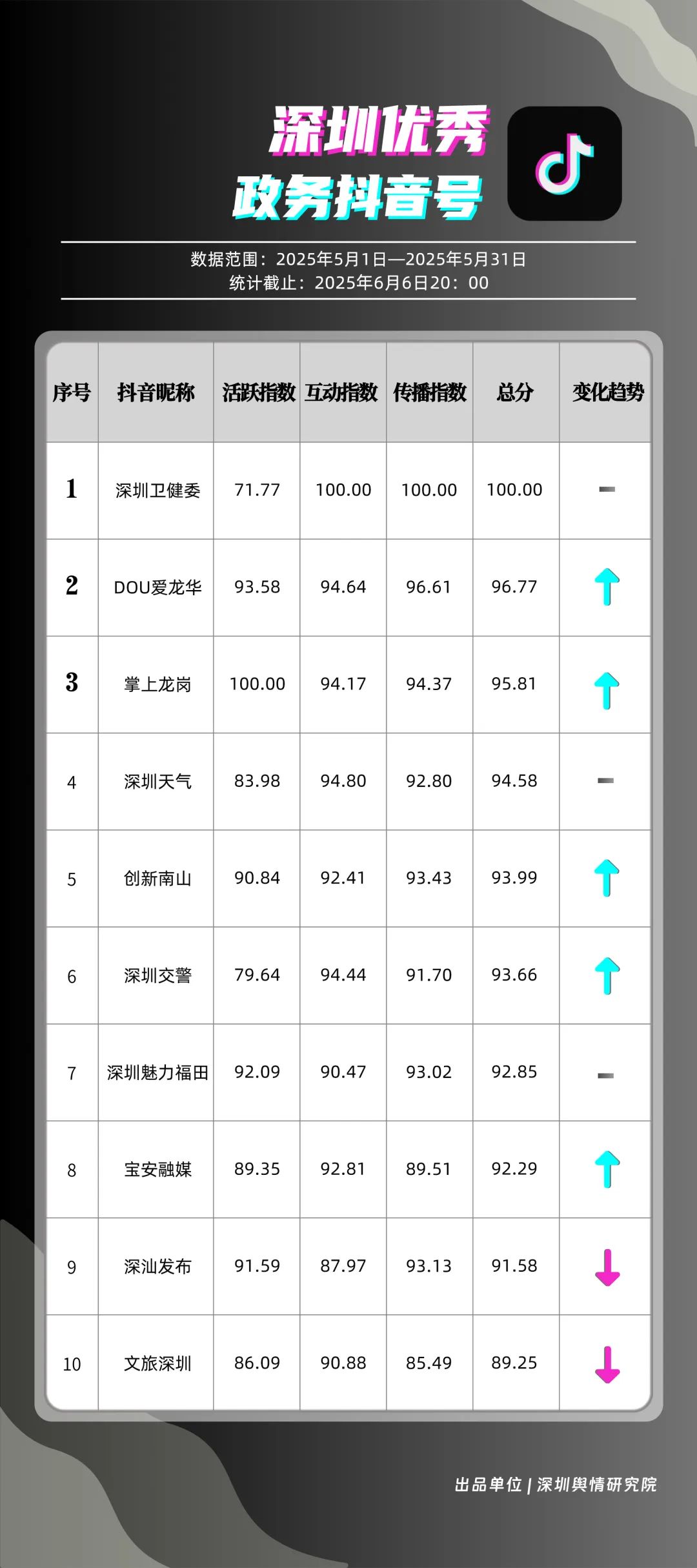 5月,“深圳衛(wèi)健委”“DOU愛(ài)龍華”“掌上龍崗”“深圳天氣”“創(chuàng)新南山”“深圳交警”“深圳魅力福田”“寶安融媒”“深汕發(fā)布”“文旅深圳”共10個(gè)政務(wù)抖音號(hào)獲得“優(yōu)秀政務(wù)抖音號(hào)”稱號(hào)。5月,“深圳衛(wèi)健委”憑借3條極具創(chuàng)意的視頻內(nèi)容持續(xù)收獲網(wǎng)民關(guān)注,穩(wěn)居榜首之位,成為政務(wù)抖音號(hào)領(lǐng)域的標(biāo)桿?!癉OU愛(ài)龍華”“掌上龍崗”較上個(gè)月排名大幅度上升,以96.77分和95.81分位居榜單第2、3名,彰顯出積極探索創(chuàng)新傳播路徑、開(kāi)拓政務(wù)短視頻發(fā)展新可能的決心。以上優(yōu)秀政務(wù)抖音號(hào)通過(guò)多樣化的短視頻形式傳遞政務(wù)資訊,為深圳政務(wù)新媒體在短視頻領(lǐng)域的蓬勃發(fā)展注入強(qiáng)勁動(dòng)能,成為政務(wù)信息傳播的新標(biāo)桿。