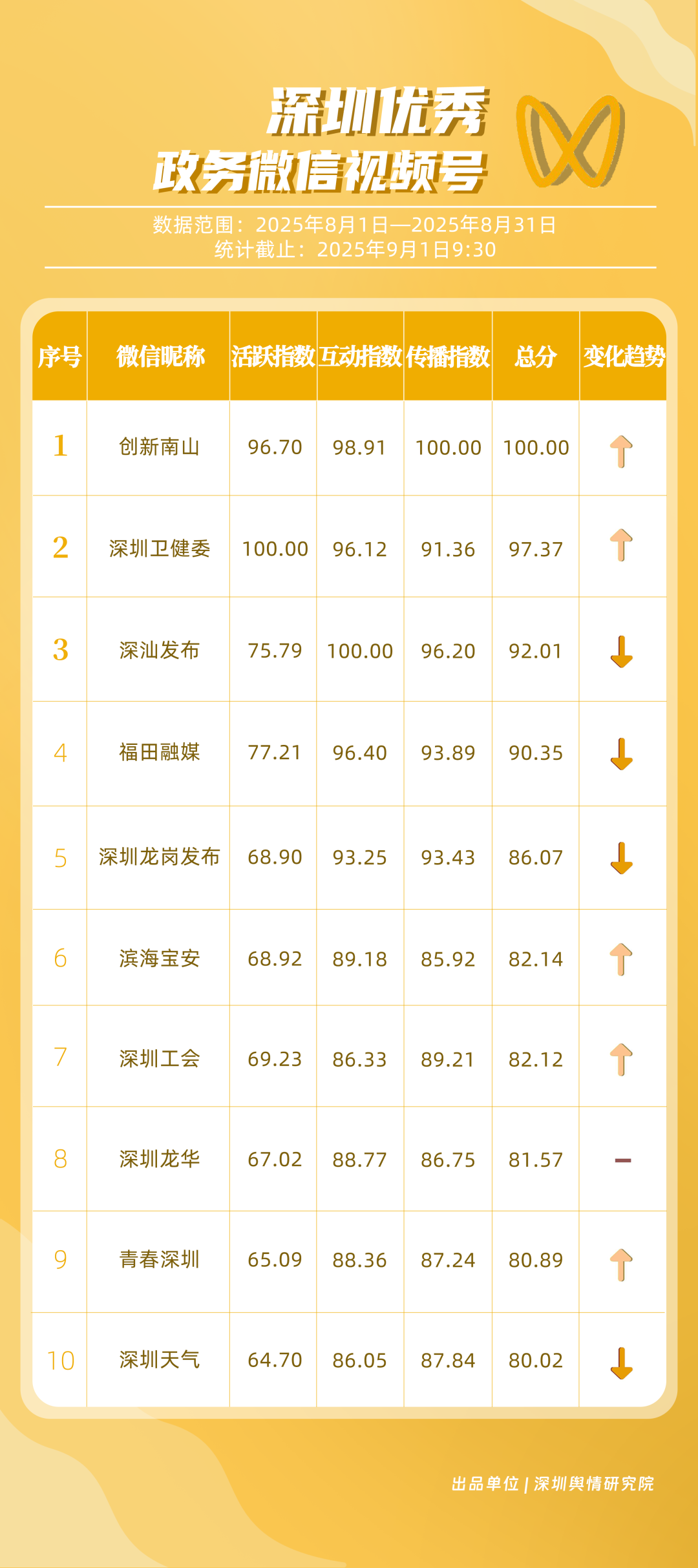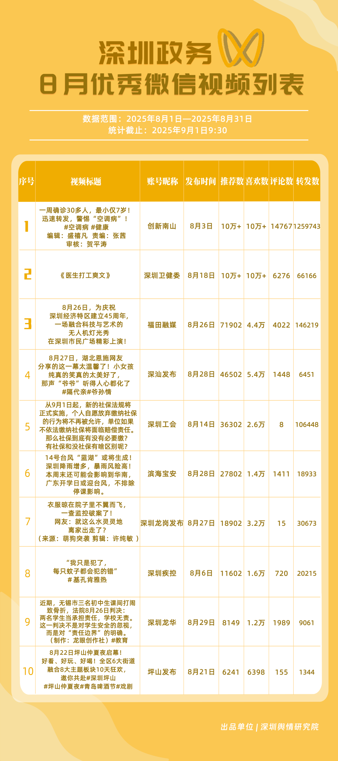 8月,“深圳衛(wèi)健委”“深汕發(fā)布”“深圳魅力福田”“深圳天氣”“掌上龍崗”“DOU愛龍華”“創(chuàng)新南山”“深圳普法”“文旅深圳”“美好鹽田”共10個(gè)政務(wù)抖音號(hào)獲得“優(yōu)秀政務(wù)抖音號(hào)”稱號(hào)?!吧钲谛l(wèi)健委”內(nèi)容吸引大量網(wǎng)民關(guān)注,4條視頻累計(jì)獲得超50萬(wàn)次點(diǎn)贊,排名從上期的第九名上升至第一名;“深汕發(fā)布”憑借較高的傳播指數(shù)評(píng)分,位列第二名,排名有所上升?!吧钲邝攘ΩL铩薄吧钲谔鞖狻钡荣~號(hào)緊隨其后,得分均在95分左右。上榜的優(yōu)秀政務(wù)抖音號(hào)深耕優(yōu)質(zhì)創(chuàng)作,精準(zhǔn)把握網(wǎng)民興趣點(diǎn),使作品收獲高點(diǎn)贊、高轉(zhuǎn)發(fā),推動(dòng)評(píng)論區(qū)形成良性互動(dòng)氛圍,以優(yōu)秀內(nèi)容提升政務(wù)傳播效能。