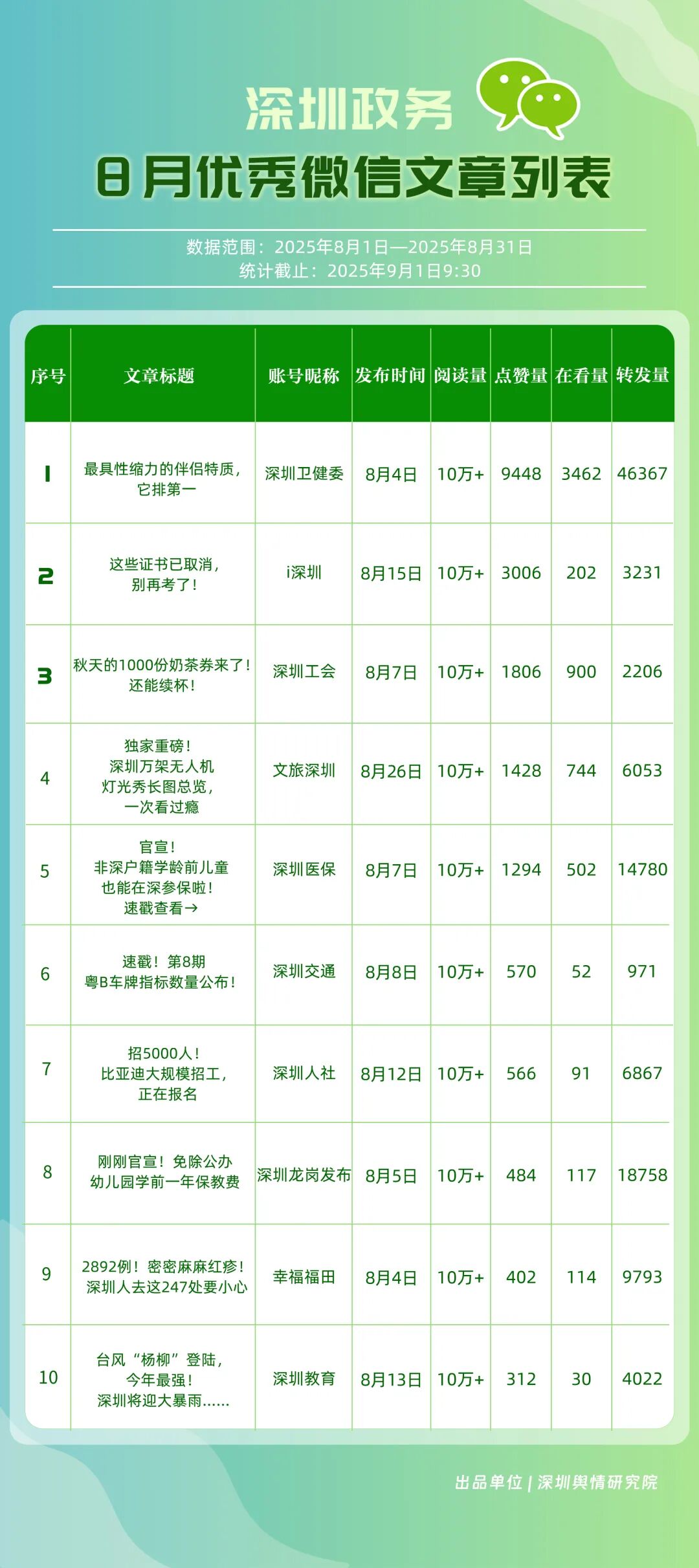 8月,“深圳幸福福田”“深圳消防”“深圳衛(wèi)健委”“創(chuàng)新南山”“深圳人社”“羅湖發(fā)布”“深圳龍崗發(fā)布”“深圳龍華”“青春深圳”“坪山發(fā)布”共10個(gè)政務(wù)頭條號(hào)入選“優(yōu)秀政務(wù)頭條號(hào)”榜單。“深圳幸福福田”憑借持續(xù)優(yōu)異的綜合表現(xiàn),以滿分成績(jī)穩(wěn)居榜單首位,彰顯出強(qiáng)大的政務(wù)傳播力與影響力;“深圳消防”“深圳衛(wèi)健委”則以穩(wěn)定的內(nèi)容質(zhì)量與深厚的民眾基礎(chǔ),持續(xù)為市民提供權(quán)威、及時(shí)的服務(wù)信息,排名穩(wěn)固?!皠?chuàng)新南山”“深圳人社”等上榜賬號(hào)亦表現(xiàn)亮眼,聚焦民生服務(wù)傳遞政策溫度,共同構(gòu)成政務(wù)新媒體矩陣的中堅(jiān)力量,為城市治理與民生服務(wù)注入鮮活動(dòng)能。