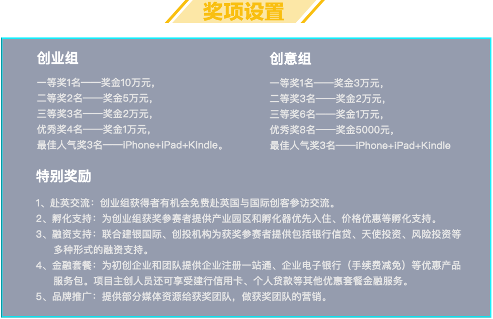 藍(lán)色夢工廠創(chuàng)客大賽由中國建設(shè)銀行深圳市分行、深圳國家高技術(shù)產(chǎn)業(yè)創(chuàng)新中心和建銀國際聯(lián)合主辦,積極響應(yīng)國家大眾創(chuàng)業(yè)萬眾創(chuàng)新,支持深圳的創(chuàng)客們實現(xiàn)夢想。大賽組委會將邀請創(chuàng)業(yè)專家、科技專家、風(fēng)險投資專家等對參賽項目的商業(yè)前景、創(chuàng)新性、成長性以及團(tuán)隊素質(zhì)等維度進(jìn)行綜合考察。我們將為獲獎創(chuàng)客團(tuán)隊提供豐厚獎金、融資支持、初創(chuàng)企業(yè)金融套餐、免費赴英國開展企業(yè)參訪交流、高新區(qū)孵化器場地優(yōu)先入駐、價格優(yōu)惠以及媒體曝光、品牌推廣等多項支持。